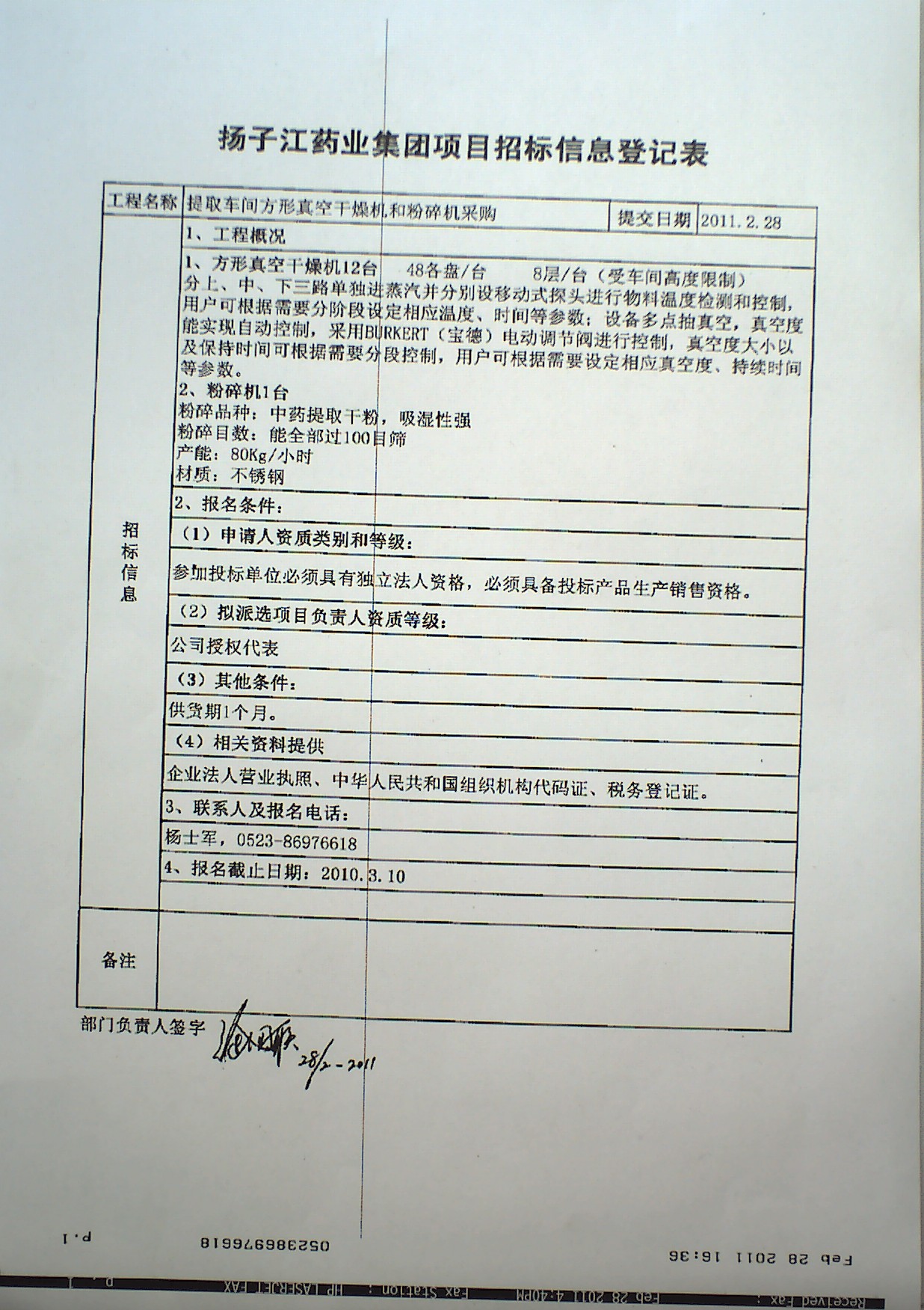 提取车间方形真空干燥机和粉碎机采购(报名)