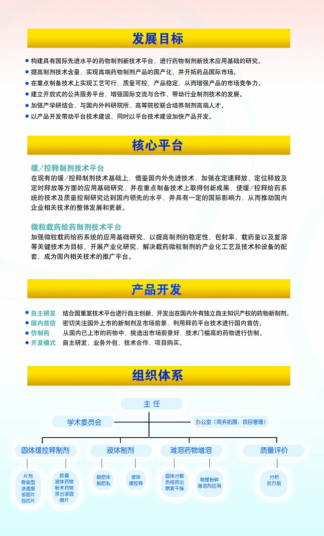 n 领导团队制订出制剂新技术平台建设计划并付诸实施.这些技术包括缓控释或微粒载药或难溶药物增溶等 Lead groups to propose plans for platform technology development. Lead groups to implement the approved plans. These platform technologies include modified release, micro/nano particle based drug delivery systems and solubility/bioavailability enhancement technologies.