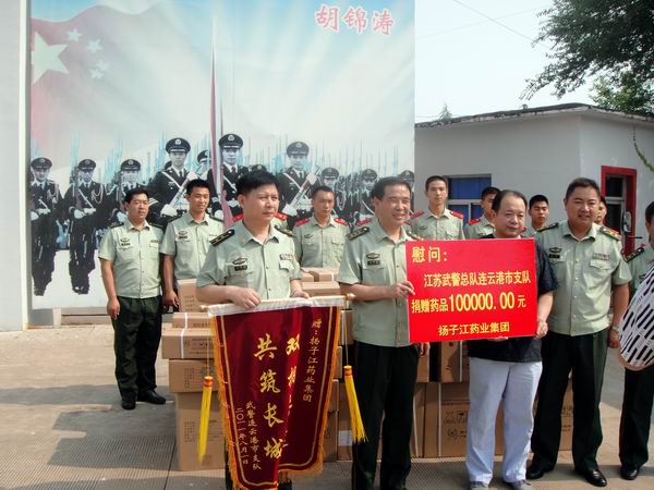 中国人民解放军三军仪仗队代表着我军形象和国家尊严,仪仗队官兵的身心健康牵动扬子江人的心。7月28日,扬子江药业集团北京公司负责同志来到驻地,送去价值10万元药品,受到官兵们的热烈欢迎。此次捐赠的10多个品种,主要针对官兵们平日紧张训练、关节、软组织损伤较多的实际,以抗菌消炎以及治疗皮肤病、胃病、腹泻性等常见疾病用药为主,一定程度上缓解了官兵们军事训练和日常生活中病痛的困扰。为感谢企业的爱心捐助,江苏武警总队连云港支队还特地向企业回赠了“双拥共建,共筑长城”的锦旗,成为军民鱼水情深的最新见证。