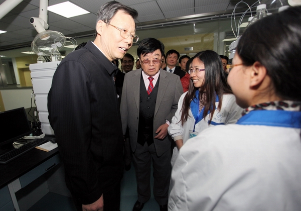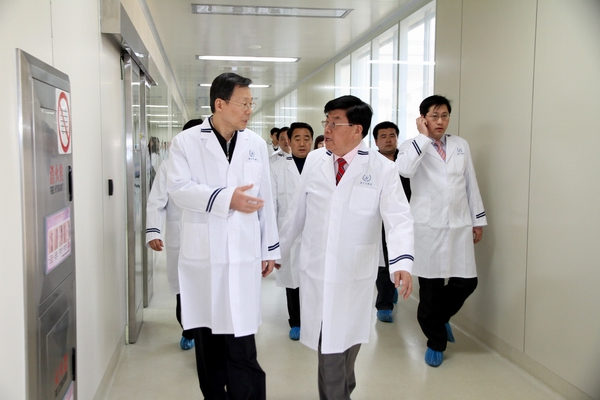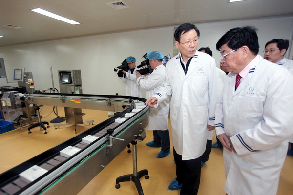 时隔四年,再次来到扬子江考察,这里巨大的变化令李学勇赞叹不己。穿行在花园式、现代化的厂区内,李省长显得饶有兴致,关切地询问企业发展情况。在冻干粉针2号车间和口服液2号车间,呈现一派繁忙而有序的生产景象,看到国际先进的生产设备在这里安家落户,自动流水生产线在高速运转,他叮嘱车间负责人一定要严格把控产品质量。在研发实验室,李学勇与科研人员进行交流,仔细询问研发项目的进展情况。得知企业研发创新团队已拥有近百名博士,多名海归高层次研发人才在这里扎根时,李学勇高兴地说:“人才是科技创新的关键,你们要高度重视做好高层次创新创业人才的引进工作。”