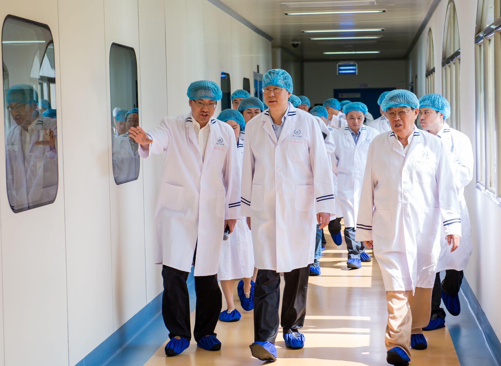 泰州市委书记蓝绍敏(中)在徐镜人董事长(右)陪同下视察冻干粉针二号车间