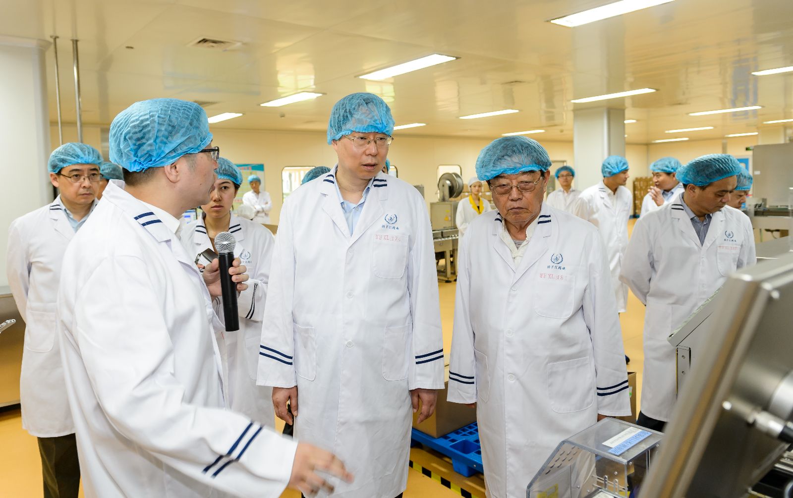 来到冻干粉针二号车间,当得知车间自2009年率先引进全自动进出料周转系统,实现了产品自动化全过程无菌转移,避免人为污染,达到国际最高无菌保证水平时,蓝绍敏点头赞许,肯定了企业质量至上的管理理念。走近全自动化包装工段,蓝绍敏饶有兴趣地在现代化的生产流水线前仔细观看,一支支冻干粉针在机械臂的操作下准确地装入盒中,生产现场繁忙有序,他关心地询问了车间生产的品种、人员分布、销售情况等。