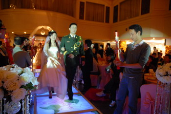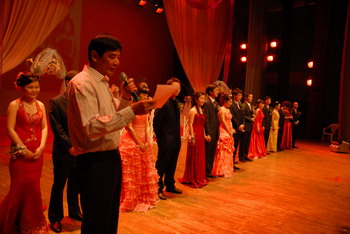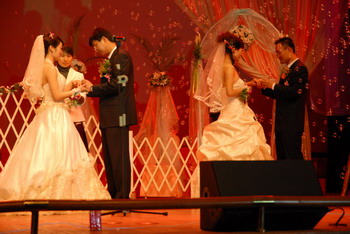 婚礼分为西式和中式两个部分。西式婚礼神圣而浪漫,4对新人身着洁白婚纱和礼服,宣读爱的誓言,互换爱的见证。“在以后的日子里不论贫穷富有,不论健康疾病我都愿意陪伴在你身边与你共同白头偕老……”心与心的交换,爱与爱的交融,交织出一个美好的誓言。在喜庆的音乐声中,4对新人行三拜之礼,感谢父母亲人和嘉宾朋友;互赠信物,深情拥吻,将集体婚礼推到高潮。