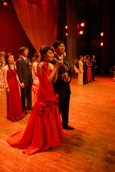 晚上十八时三十八分,婚礼庆典仪式正式开始。参加集体婚礼的新人们,身着礼服和婚纱,脸上掩饰不住幸福的笑颜。伴随着婚礼进行曲,他们手挽手踏上红地毯,穿过鲜花拱门缓缓走向舞台,接受亲朋好友的美好祝福。