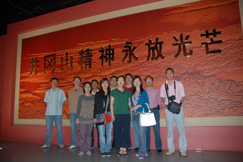 在革命摇篮井冈山,大家参观了井冈山革命博物馆,瞻仰了井冈山革命烈士陵园,缅怀革命先烈的丰功伟绩,每个人的心灵都经受了一次洗礼。10多人举起鲜红的党旗,誓志把井冈山精神在扬子江继承发扬广大。睹物思人,依稀听到当年黄洋界上炮声隆,仿佛看到毛泽东和朱德在井冈山胜利会师的欢庆场面,更为毛主席当年挥毫“星星之火可以燎原”的英雄气概而振奋。80多年前,革命的火种在井冈山点燃,中国革命从这里一步一步走向胜利;今天,永放光芒的井冈山精神,正激励着扬子江人为振兴民族医药不懈奋斗。