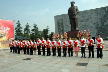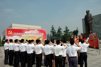 入党宣誓仪式在激昂的《国际歌》中举行。来自集团各条战线上的14名新党员和17名预备期满转正的党员,在毛泽东主席塑像前,面对鲜红的党旗,举起右手,发出了共产党人的铮铮誓言,表达了对党的事业的无限忠诚和时刻牢记全心全意为人民服务的宗旨。