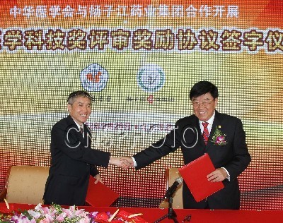 图片说明: 9月26日,中华医学会副会长兼秘书长刘雁飞(左),扬子江药业集团董事长徐镜人(右)分别代表中华医学会和扬子江药业集团签署战略合作协议。根据协议,从2012年至2016年扬子江药业将每年出资数百万元人民币支持中华医学科技奖的评选。卫生部部长、中华医学会会长陈竺出席签约仪式。由扬子江药业支持、中华医学会设立主办的中华医学科技奖是中国医药卫生行业最具权威和影响力的科技奖,于2000年设立,已评出859项医学成果奖。 中新社发 曾利明(政文部) 摄 ( 2012.09.26 )
